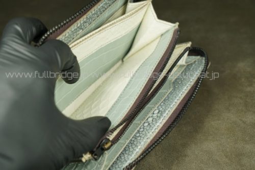 異常と思えるほどに硬いリン酸カルシウムに覆われたイバラエイは、角R面取り加工、エッジ加工など特殊なオリジナルの技法でスムースな仕上がりに。触れてみればその滑らかな極上の仕上げと分かります。またラウンドファスナーのファスナーはコーナーの角度と作りでファスナーがコーナーを通る際にどれだけスムーズがどうか使い易いか分かります。