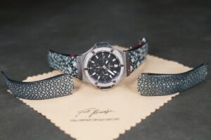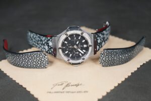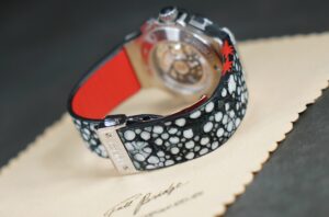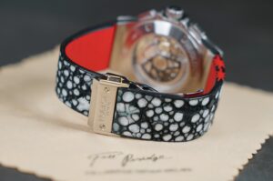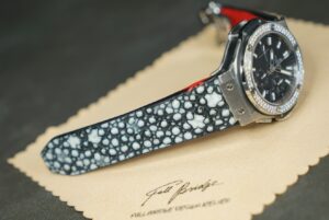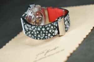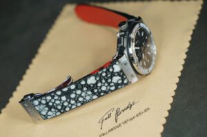 カイラギ(梅花皮)皮革という最高峰かつ極上素材に、クラフツマンシップとオーナー様の感性が重なり合い、ストラップはただのパーツではなく、