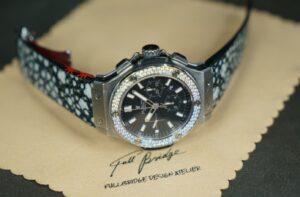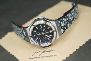 ウブロビッグバンのストラップ制作は他社にとっては切れる恐れがあるため危険を伴う難題ですが、私は数多くのテスト実績を積み重ね、常に確実な安全マージンを挑み続けています。だからこそ可能となった、この一作。