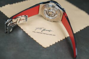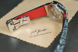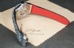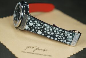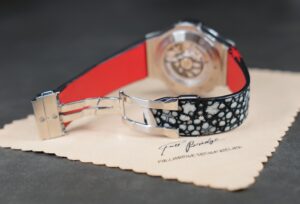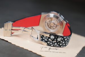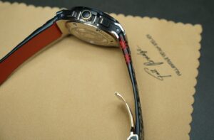 もちろん純正ディプロイメントDバックルを(問題なくご使用出来る様に)移植し、コバ面のベースカラーはオールマットBLACKで統一。そこに赤色の手描きスターマークを添えることで、強さと大人の遊び心を宿しました。